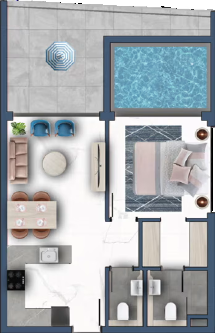 The development offers a selection of studios, one-bedroom, and two-bedroom apartments, thoughtfully designed to enhance space, comfort, and natural light. Many units feature private pools on the balcony, creating a unique resort-style atmosphere within the home.
