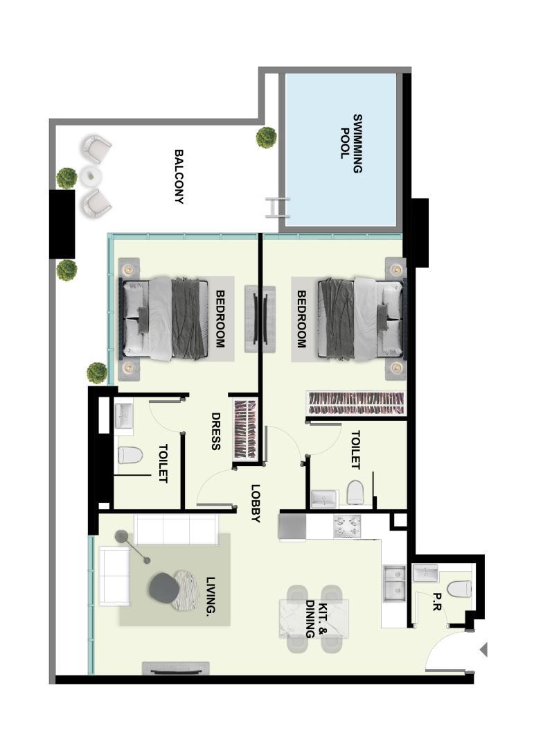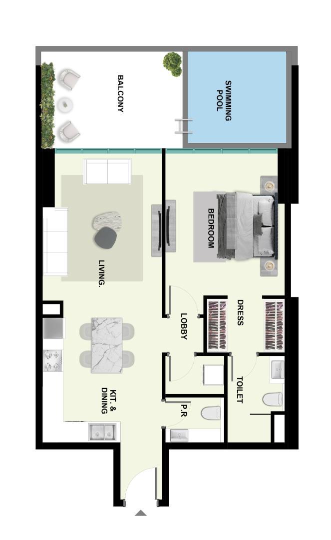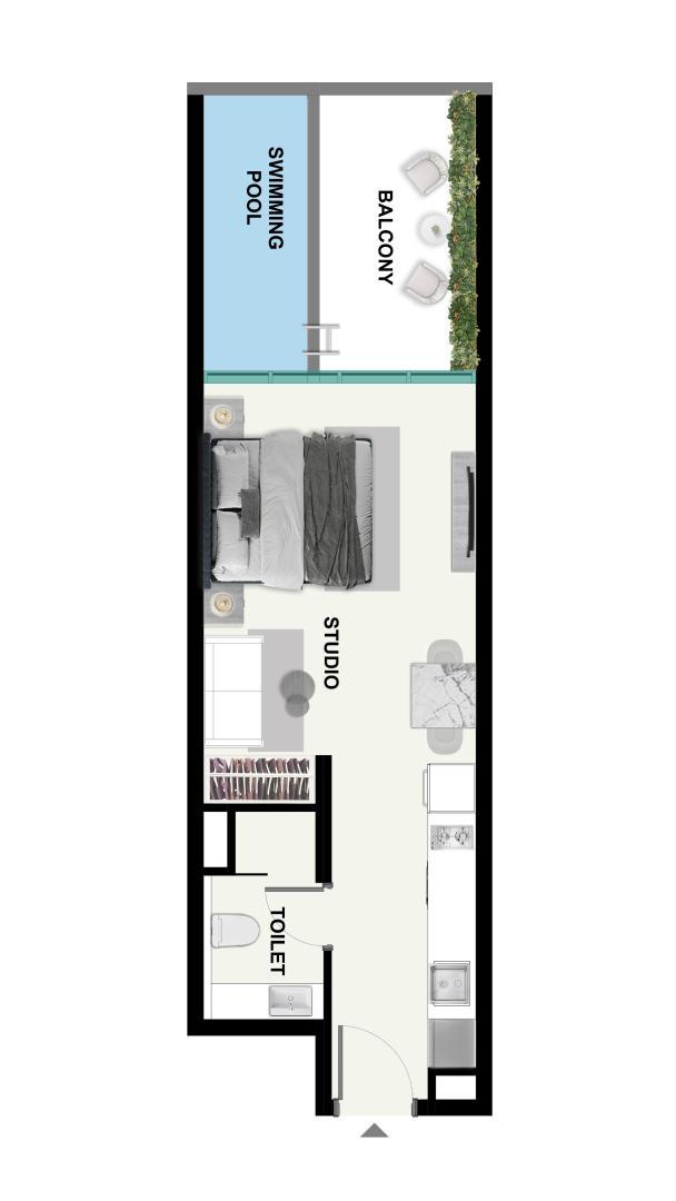 The development features a range of thoughtfully designed apartments, including studios, one-bedroom, and two-bedroom units. The residences emphasize smart layouts, natural light, and functional spaces. Select units include private pools on the balconies, adding a unique resort-style touch to daily living.